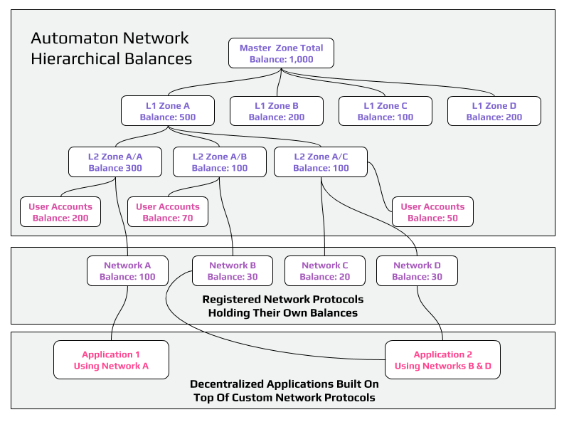 The network is powered by its own token, which is used to register custom network protocols, rewarding validators, and executing transactions. Parent networks are always aware of the balance held by its children. While processing transactions token balances do not need to leave a zone unless its destination is outside its entire tree.